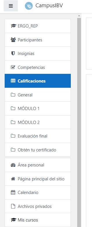 ¿Cómo puedo ver mis calificaciones?Puedes consultar tus calificaciones de los ejercicios en el bloque de los 3 guiones que se encuentra en el margen izquierdo del curso y luego pinchando en Calificaciones. En este apartado encontrarás las notas obtenidas en los ejercicios y prácticas entregadas, puedes verlas en el recuadro que aparece en este apartado y así puedes comprobar la media general del curso y de cada ejercicio propuesto. ![]() | |