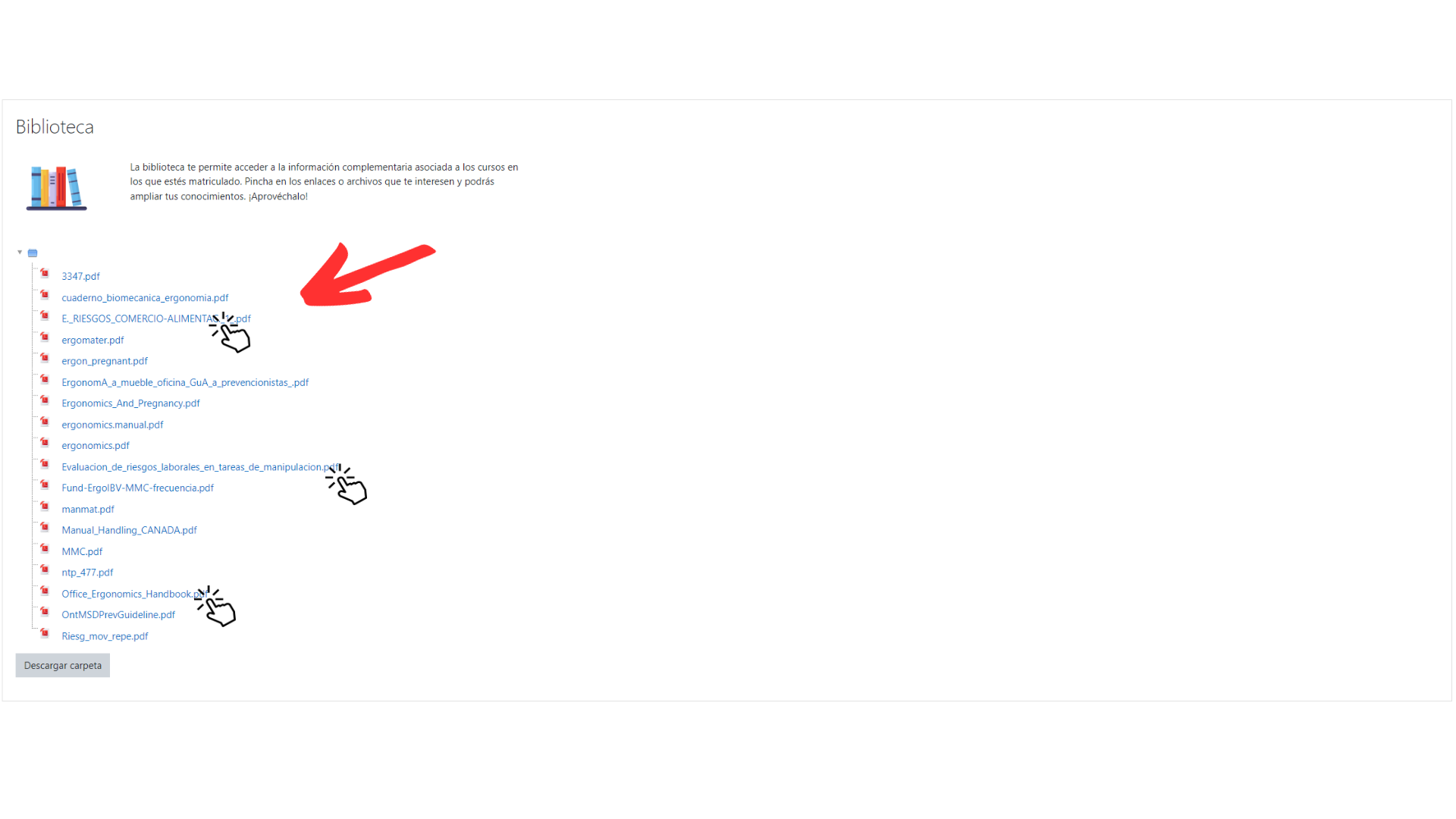 ¿Cómo obtengo un documento de la biblioteca?Para acceder a la biblioteca tendrás que entrar en el curso e ir al bloque general del curso que se encuentra en la parte de arriba. Ahí deberás hacer clic sobre la biblioteca para acceder a ella. ![]() En la biblioteca podrás obtener documentación de interés relacionada con el curso. Tan sólo tienes que entrar en ella y verás una lista de títulos para elegir el que más te interese. Pincha sobre el título que quieras y podrás descargarte el archivo.