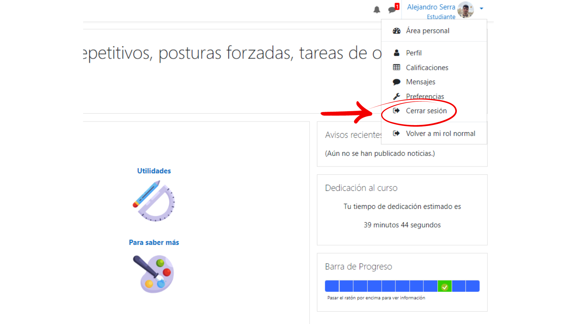 ¿Cómo puedo salir del Campus IBV de forma segura?Para abandonar el curso y desconectarte del campus deberás pinchar sobre el texto "Cerrar sesión" (en la cabecera de la página en la parte derecha) que encontrarás debajo de tu nombre.
